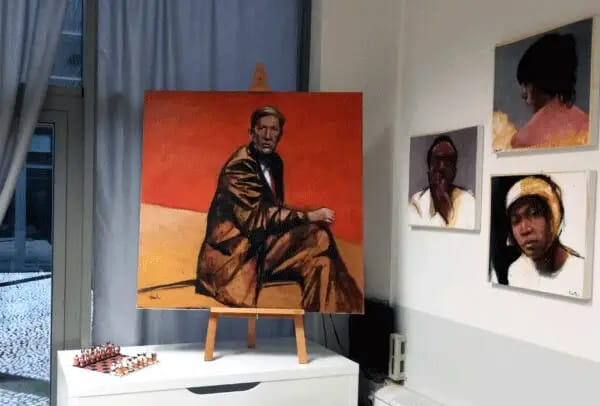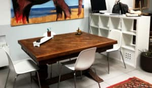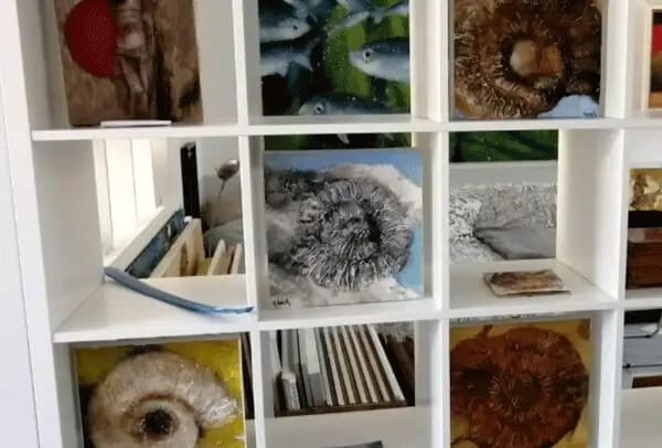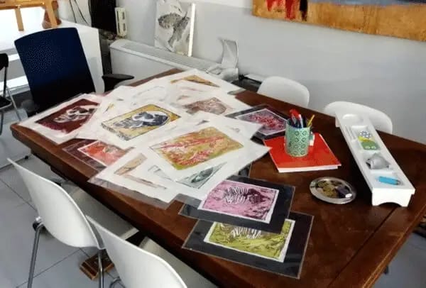 Lo spazio del mio studio è un open space che si presta a piccole mostre, corsi e presentazioni che condivido con il mio compagno e pittore Gerardo Lunatici. Si trova al piano terra di un ex storico cinematografo cittadino, l’Odeon, ristrutturato di recente, nei pressi dell’EFSA e del Parco Ducale.